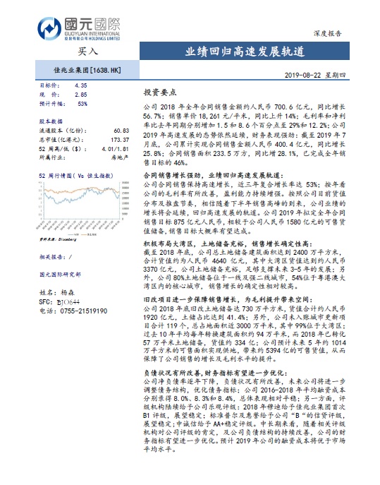 国元国际预计,佳兆业集团未来业绩的增长将会延续,回归高速发展的轨道。按照目前行业整体平均估值测算,对应目标价4.35 港元,首次覆盖给予“买入”评级。