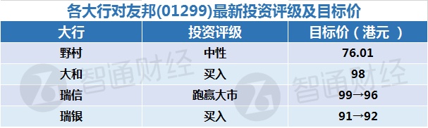 四、各大行对友邦(01299)最新投资评级及目标价: