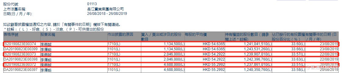 智通财经APP获悉,联交所最新资料显示,在8月20日、8月22日和8月23日进行了三笔交易后,李嘉诚旗下的李嘉诚基金会合共增持长实集团(01113)786.85万股,每股作价分别为55.2992港元,54.2922港元及54.6365港元,总金额约为4.3亿港元,增持后,李嘉诚基金在长实集团的多头头寸从33.38%增至33.60%。
