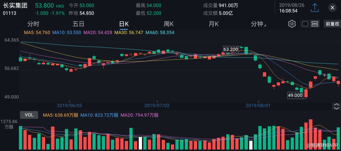 截至今日收盘,长实集团(01113)跌1.91%,报53.80港元。