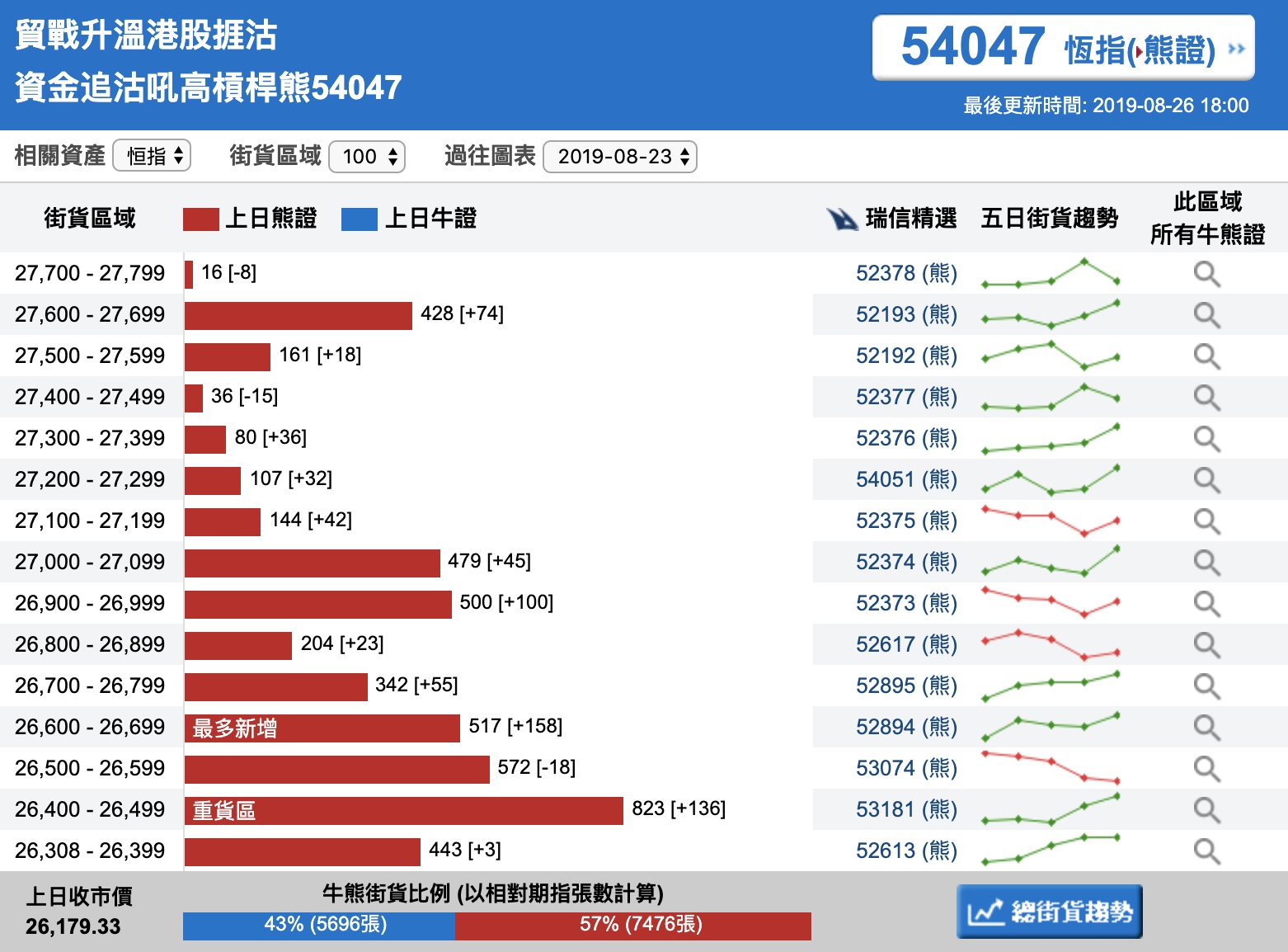 智通财经APP获悉,截至8月27日,恒指最新的牛熊街货比例为43:57。瑞信恒指牛熊证街货分布图中的数据显示,熊证街货重货区在26400-26499区间,该区间最新熊证数量为823张,较上一交易日增加136张,最多新增在26600-26699区间。牛证街货重货区在25600-25699区间,该区间最新牛证数量为551张,比上一交易日减少49张;最多新增区间在25800-25899区间。