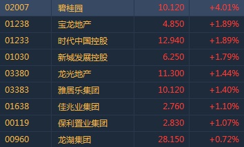 智通财经APP获悉,内房股随A股集体反弹,碧桂园(02007)升逾4%领涨,截至9时43分,碧桂园涨4.01%,报价10.12港元,宝龙地产(01238)涨1.89%,时代中国(01233)涨1.89%,龙光地产(03380)涨1.44%,佳兆业(01638)涨1.1%。