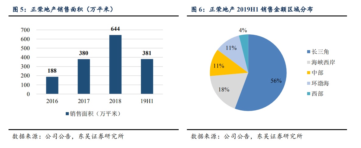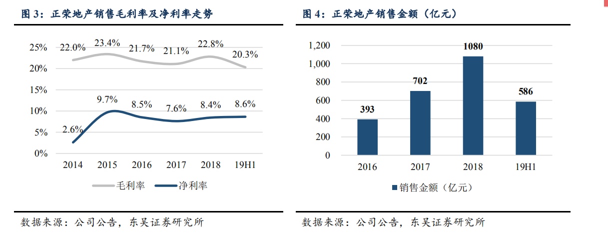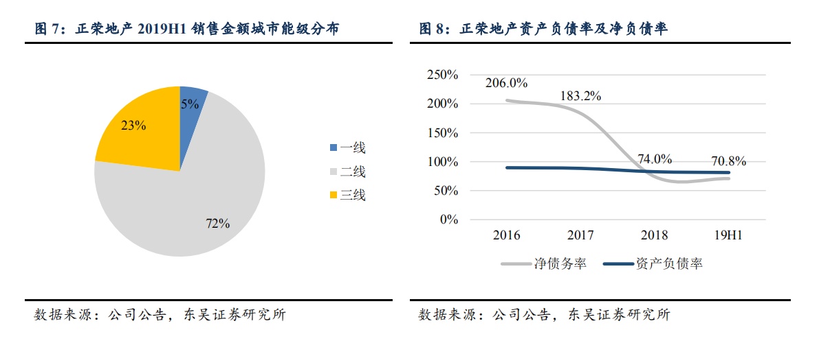 业绩增长较为稳健。2019 年上半年公司实现营业收入 136.5 亿元,同比增长 11%;实现归母净利润 9.3 亿元,同比增长 11%;业绩增长稳健,毛利率为 20.3%,同比下降 1.7 个百分点;净利率为 8.6%,同比提升 0.9个百分点。2019 年上半年公司实现销售额 586 亿元,同比增长 1%;销售面积 381 万平米,同比增长 13%。从区域布局看,公司在长三角、海峡西岸、中部、环渤海、西部销售金额占比分别为 55.7%、17.9%、11.6%、10.9%、3.9%;从城市能级看,在一线、二线、三线城市占比分别为 5.5%、71.5%、23%。2019 年公司提出全年销售计划 1300 亿元,1-7 月已实现全年销售计划的 53%。