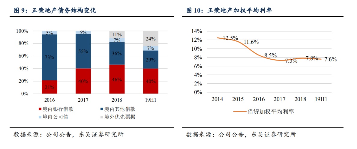 控杠杆成果显著,融资成本有所回落。截至 2019 年上半年,公司资产负债率 81.3%,同比下降 5.3 个百分点;净负债率为 70.8%,同比下降101 个百分点,较 2018 年末下降 3.2 个百分点。公司融资结构持续优化,总债务规模 525.29 亿元,其中境内银行借款、境内其他借款、公司债、境外优先票据分别占比 40%、29%、7%、24%;上半年加权融资成本7.6%,较 2018 年全年下降 0.2 个百分点。