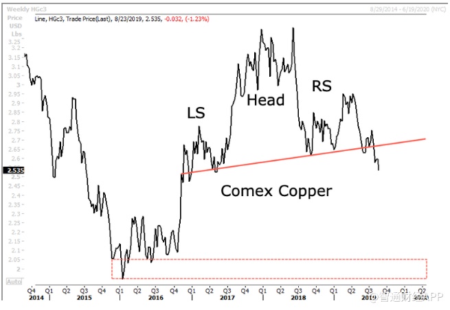 价格上涨和下跌可能会在2019年下半年创造一个巨大的头肩形态,或至少在2020年上半年的某个时间形成。如果铜价能打破头肩的颈线 (neckline),可能会重新测试2016年的水平,大约在2-2.15。