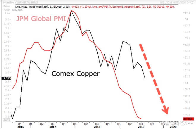 在“教科书式”的理论中,价格暴跌与PMI指数跌至50以下有关,这预示着全球制造业衰退即将来临,或者已经在进行中。