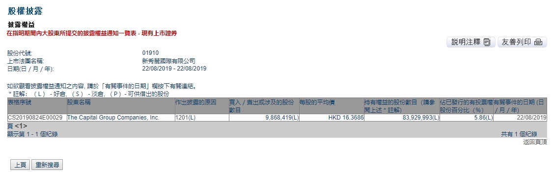 智通财经APP获悉,联交所最新资料显示,The Capital Group于8月22日对新秀丽(01910)减持986.84万股,每股平均价16.3686港元,涉及总金额约为1.62亿港元。减持后The Capital Group最新持股数目约为8393万股,最新持股比例为5.86%。