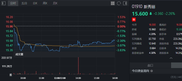 截至今日收盘,新秀丽(01910)跌2.26%,报15.6港元。