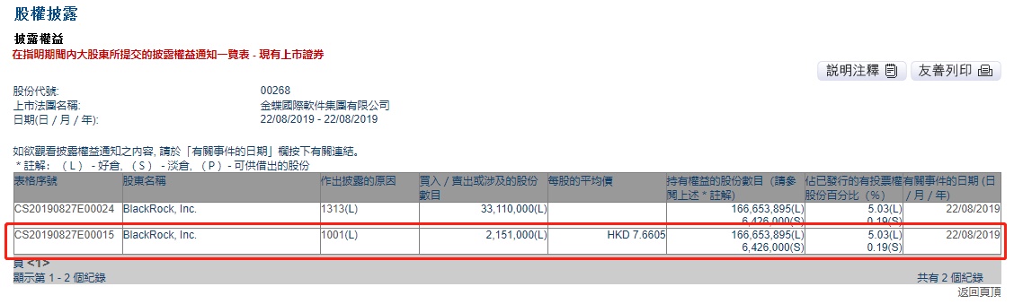 智通财经APP获悉,联交所最新资料显示,8月22日金蝶(00268)获贝莱德增持215.1万股,每股作价7.6605港元,总值约为1648万港元,最新持股数目约为1.67亿股,最新持股比例为5.03%。