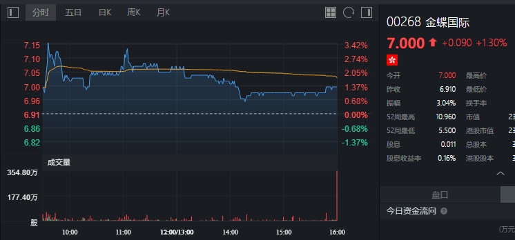 截至今日,金蝶(00268)涨1.3%,报7港币。
