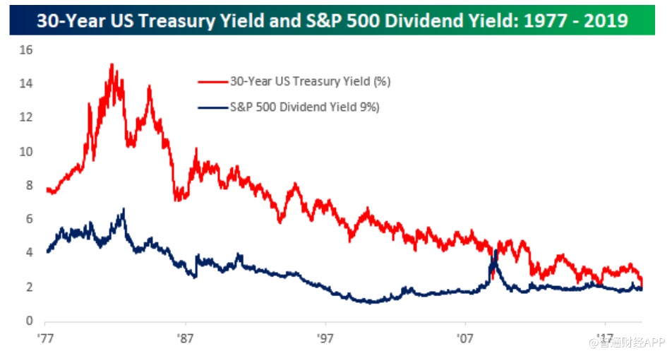Bespoke Investment Group所检阅的数据可追溯到四十年前。除了金融危机之外,另一次股息率接近长债收益率事件发生的时间是2016年7月,也就是英国脱欧公投之后。根据Bespoke的说法,当时标普500指数的股息率在30年期收益率的0.01%之内。
