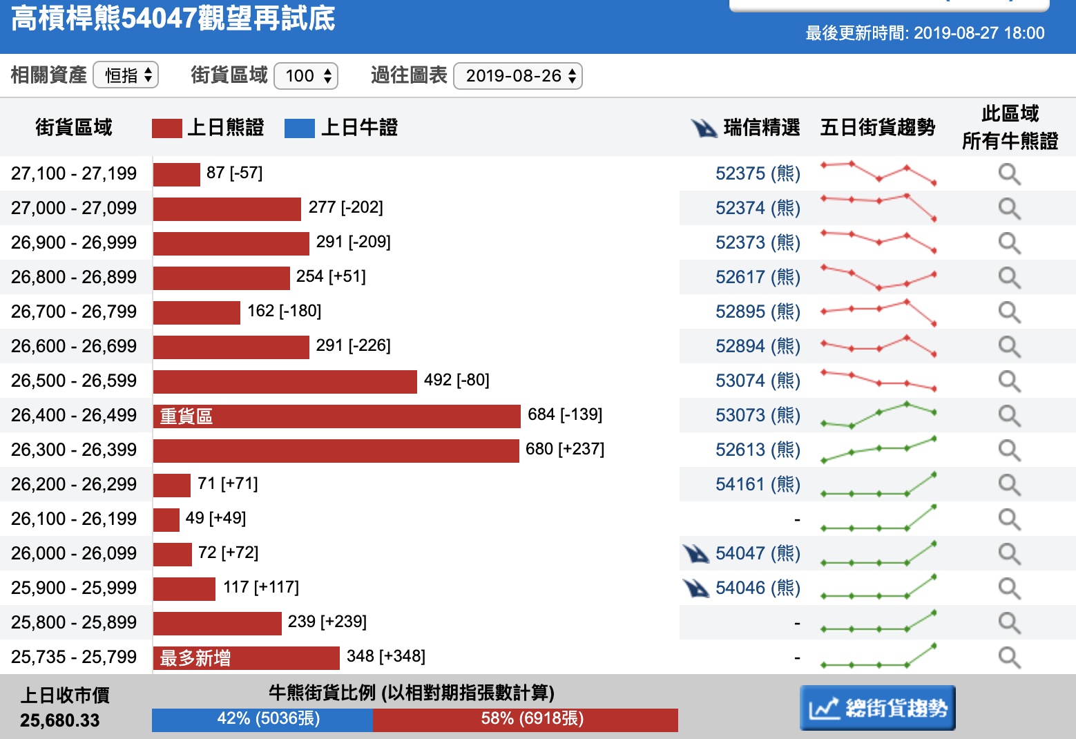 智通财经APP获悉,截至8月28日,恒指最新的牛熊街货比例为42:58。瑞信恒指牛熊证街货分布图中的数据显示,熊证街货重货区在26400-26499区间,该区间最新熊证数量为684张,较上一交易日减少139张,最多新增在25735-25799区间。牛证街货重货区在25000-25099区间,该区间最新牛证数量为653张,比上一交易日增加206张;最多新增区间在25000-25099区间。