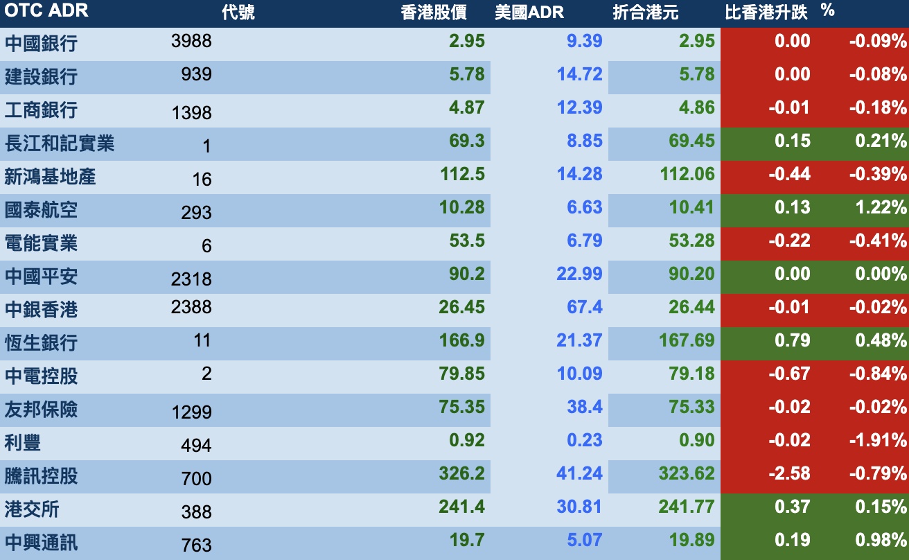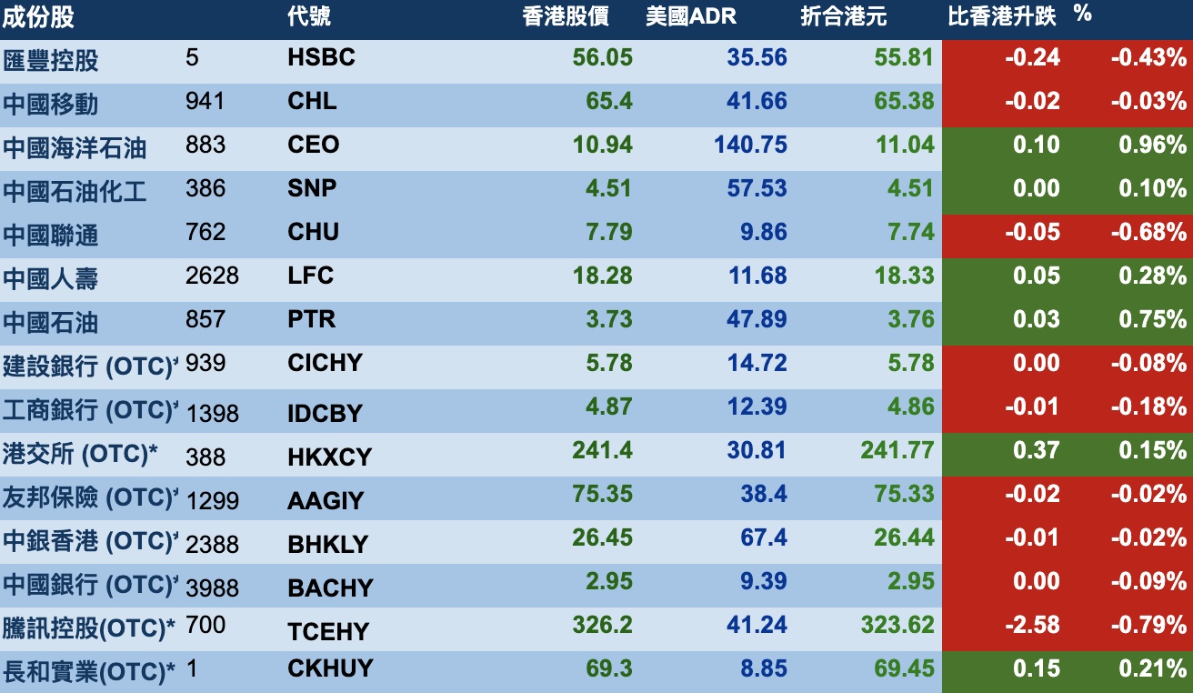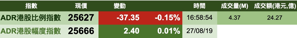智通财经APP获悉,8月28日消息,美股先高后低,但港股ADR指数全日偏弱。按比例计算,收报25627点,跌37.35点。大型蓝筹股续软,汇丰控股(00005)收报55.81元,较港收市跌0.24元;腾讯控股(00700)收报323.62元,较港收市跌2.58元。