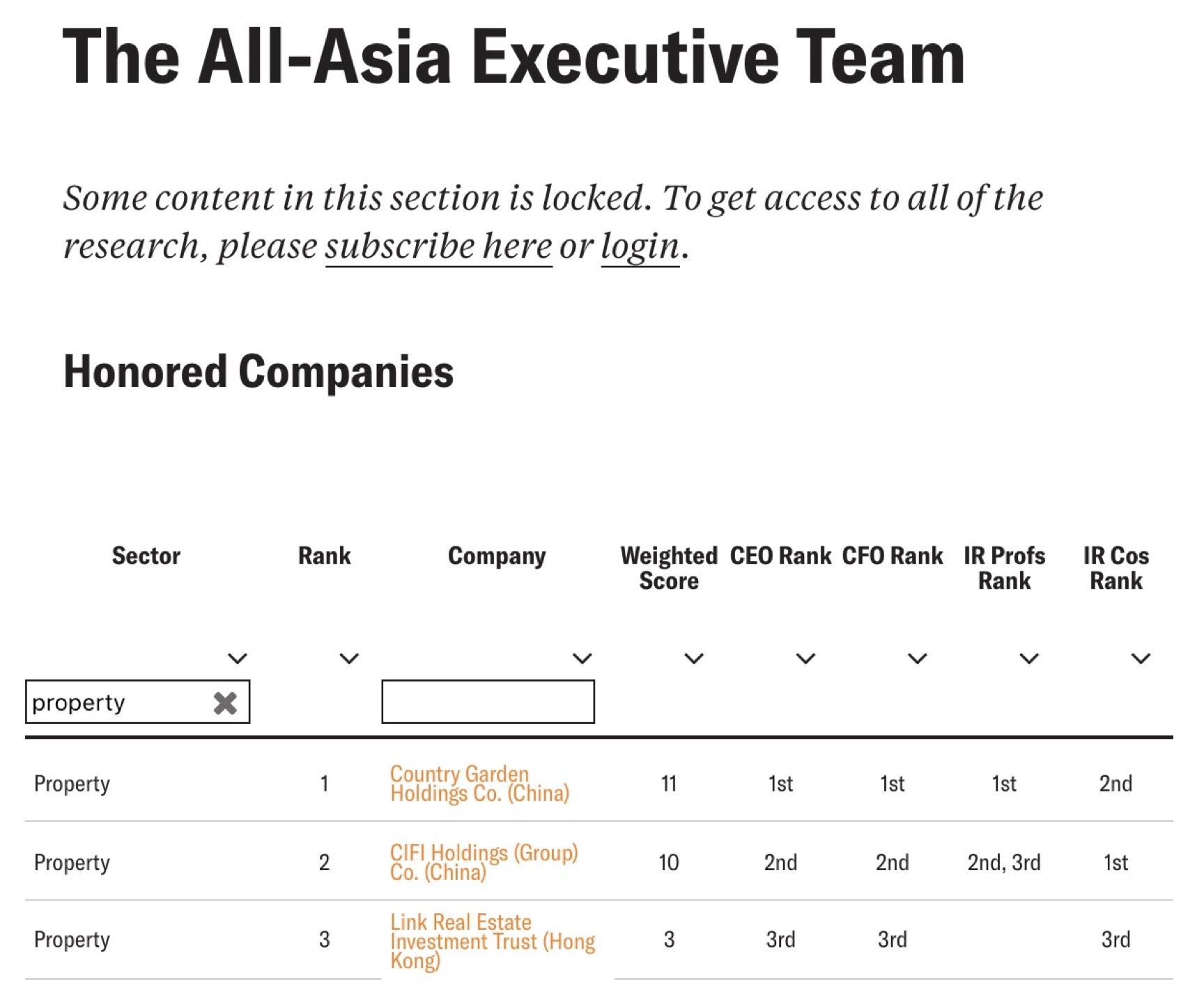 《机构投资者》杂志是世界上最有影响力的金融杂志之一。杂志每年针对亚太地区公司开展管理团队评选,其年度排名票选已成国际资本市场的一大盛事,被业内公认为全球投资的风向标。不同于其他的奖项评选,此排名必须由经过主办方官方认证身份的金融界人士投票产生,具有绝对的权威性及含金量,是境外资本市场最具权威性的排名。
