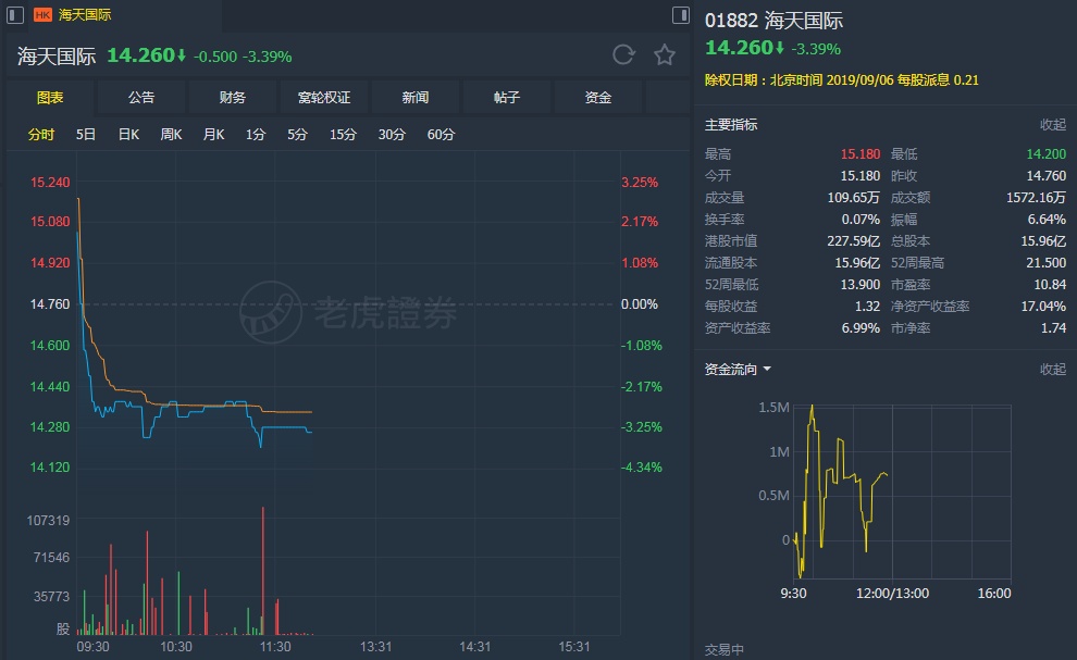 智通财经APP获悉,里昂发表报告称,海天国际(01882)的上半年核心盈利同比下降14.3%,较该行的预期低出4.3%,主要由于国内销售表现差过预期,以及毛利率略为低过预期所致。该行下调集团2019/20/21年盈测11.2%、11.5%及11.2%,目标价由原来的18港元下调至15.5港元,维持“跑赢大市”评级。