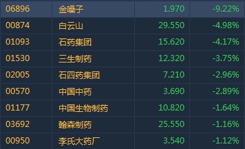 智通财经APP获悉,医药板块随A股整体走弱,金嗓子(06896)领跌板块。截至14时28分,金嗓子跌9.22%,报价1.97港元,白云山(00874)跌4.98%,三生制药(01530)跌3.75%,中生制药(01177)跌1.64%。