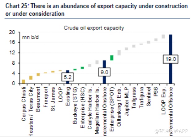 随着管道的建设,出口能力也需要增加。整个墨西哥湾沿岸,德克萨斯州和路易斯安那州的航运设施正在扩建。据花旗称,美国很快将拥有每天600万桶的出口能力,甚至更多。