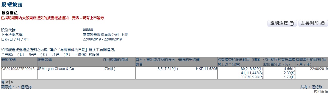 智通财经APP获悉,联交所最新资料显示,摩根大通于8月22日对华泰证券(06886)减持651.73万股,每股平均价11.6206港元,涉及总金额约为7573.49万港元。减持后摩根大通最新持股数目约为8021.86万股,最新持股比例为4.66%。