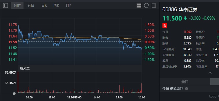 截至今日收盘,华泰证券(06886)跌0.69%,报11.5港元。