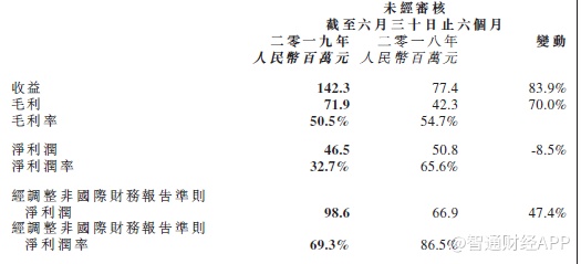 具体来看,2019年上半年,维亚生物实现收入约1.42亿元,同比上升83.9%;毛利约为7190万元,同比上升70%;扣非净利润约为9860万元,同比上升47.4%。经调整Non-FRS每股基本盈利0.08元,拟派发中期股息每股0.5港仙。
