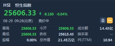 智通财经APP获悉,恒生指数开盘跌9.15点或0.04%,报25606.33点。国企指数跌0.15%,报9965.97点。红筹指数跌0.56%,报4135.45点。大市盘前成交14.48亿港元。隔夜美股三大股指集体收涨,道指涨近260点。