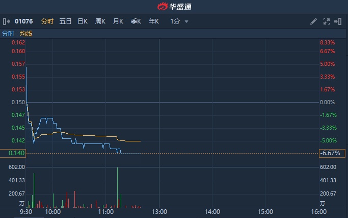 智通财经APP获悉,博华太平洋(01076)将于今日放榜,此前曾发盈警,预计中期由盈转亏且收益减少。截至发稿,跌6.67%,报0.14港元,成交额540.49万港元。