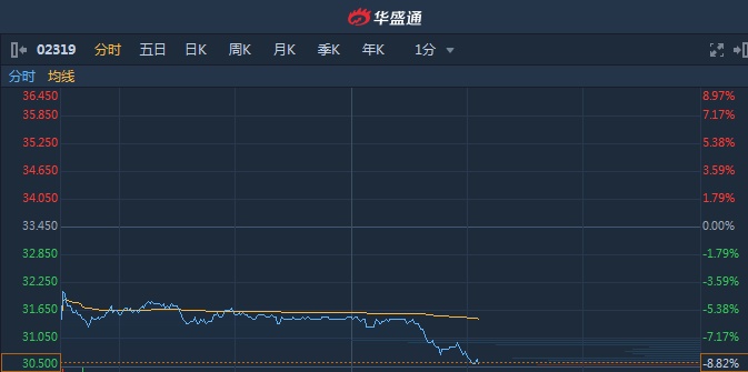 智通财经APP获悉,蒙牛乳业(02319)绩后股价大幅走弱,午后跌幅扩大至8.8%,领跌蓝筹,拖累指数25点暂居第一。截至14时05分,跌8.82%,报价30.5港元,成交额5.856亿。