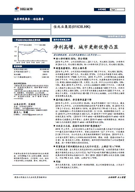 8月29日,国信证券发布研究报告称佳兆业集团(01638)营收增长显著,在大湾区尤其是在深圳的土地资源丰富,未来有望受益于深圳建设中国特色社会主义先行示范区;“地产开发+城市更新”模式在推动公司持续发展的同事有效保证其盈利水平,预计2019、2020年EPS分别为0.55、0.66元,对应PE为4.5、3.8X,综合考虑,对佳兆业集团评级上调至“买入”。
