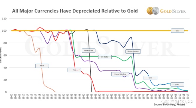 从1971年开始,将几乎任何主要的世界货币与黄金进行比较,可以看到它们基本上失去了所有价值。从长远来看,它看起来并没有好转。随着时间的推移,黄金持有其购买力,法定货币则没有。