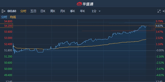 智通财经APP获悉,青岛啤酒(00168)中期业绩超预期,获野村重申“买入”评级,目标价看高至62.3港元,截至15时38分,涨4.63%,报价54.2港元,成交额1.493亿。