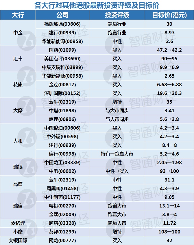 五、各大行对其他港股最新投资评级及目标价: