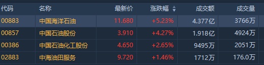 截至发稿,中国海洋石油(00883)涨5.23%,报11.68港元;中国石油股份(00857)涨4.27%,报3.91港元;中国石油化工股份(00386)涨2.65%,报4.65港元;中海油田服务(02883)涨1.57%,报9.73港元。