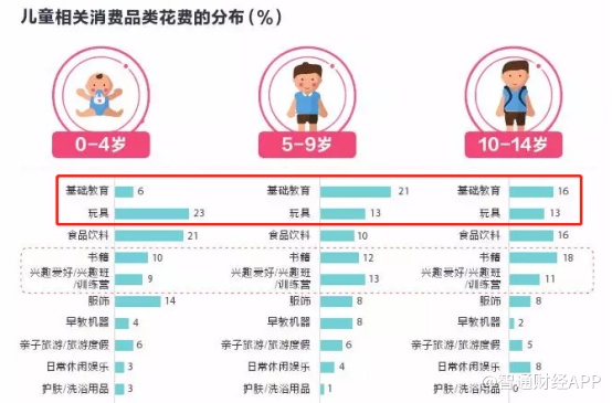 《2018中国少儿家庭洞察白皮书》数据显示,目前与儿童相关的消费品类花费分布中,贯穿0-14岁的儿童时代,基础教育与玩具都是比例较大的消费品类。而这也为玩具研发商提供了最新的产品需求导向,“教育+玩具”相关产品应运而生。