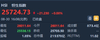 智通财经APP获悉,恒生指数开盘涨1.2%,午后出现一轮跳水,尾盘跌幅逐渐收窄。截至收盘,恒生指数涨点21.23或0.08%,报25724.73点,全日成交额达873.48亿。国企指数涨0.91%,报10083.2点,红筹指数涨0.5%,报4155.88点。