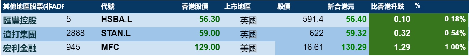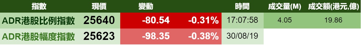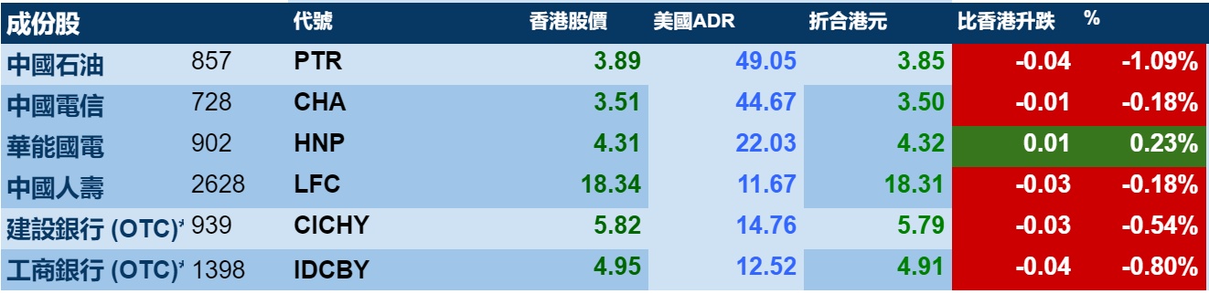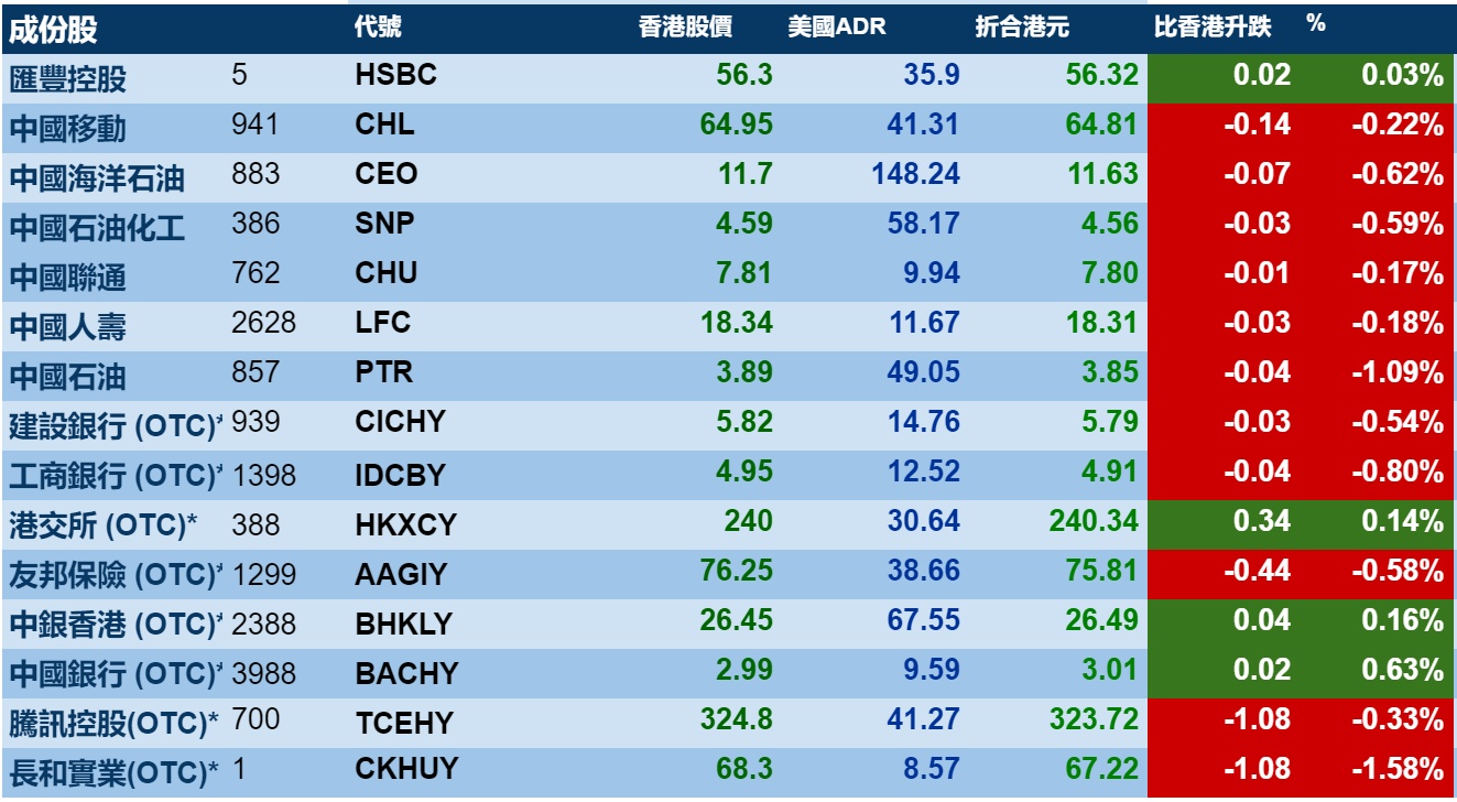 周五美股涨跌不一,但港股ADR指数却继续下跌,按比例计算,收报25640点,跌80.54点。汇丰控股收报56.32元,较港收市涨0.02元;腾讯控股收报323.72元,较港收市跌1.08元。其他数据如下: