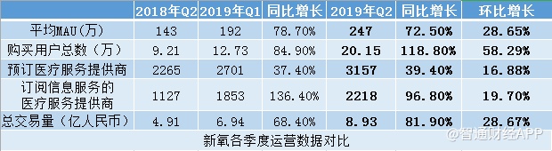从运营数据看,新氧各项指标依旧快速增长。其中,平均MAU为247万,同比增长72.5%,环比增长28.65%,用户数量持续创新高,并保持高增长。购买用户数量的增长则更为快速,2019年二季度为20.15万,同比增118.8%,增速远高于一季度,且转化率明显上升。2018年二季度,购买用户数占平均MAU的比例为6.44%,2019年一季度上升至6.63%,二季度则上升至8.16%。
