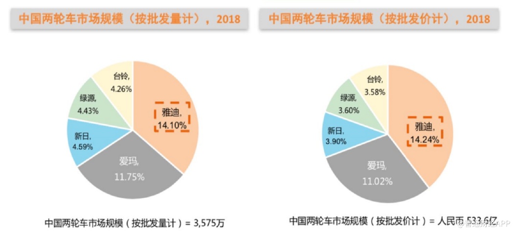 按批发量计算,2018年雅迪的市场份额较第二名和第三名分别高出2.35个百分点和9.51个百分点;按批发价计算,雅迪2018年的市场占有率达到14.24%,分别高出第二名和第三名3.22个百分点和10.34个百分点,市场龙头地位稳固。