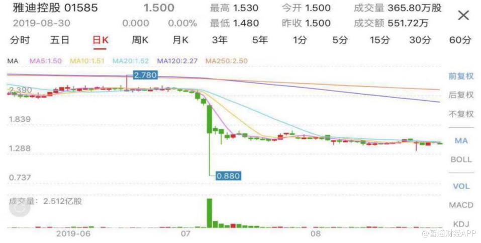雅迪可谓电动两轮车行业的“真金”,但“不怕火炼的真金”也有遭遇火灾的时候。智通财经注意到,2019年7月4日至7月8日期间三个交易日,雅迪股价出现连续大幅下挫,最高跌幅超过6成,一时间市场一片诧异之声:行业龙头雅迪何以遇此“黑天鹅”?