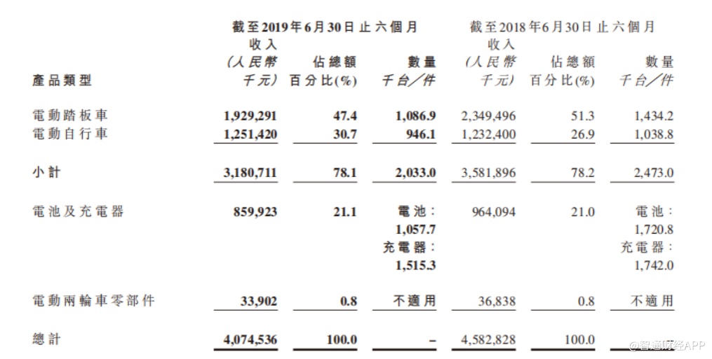 产品销售方面,2019年上半年,公司电动踏板车及电动自行车的总销量由上年同期的约247.3万台减少至约203.3台。电动两轮车、电池及充电器以及电动两轮车零部件的销售收入由45.83亿元减少11.1%至40.75亿元。