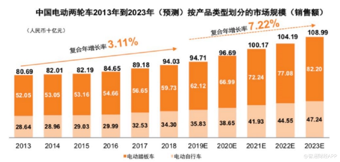 从行业发展角度而言,据弗若斯特沙利文预计,中国电动两轮车市场2019年至2023年的市场规模将达到1089.9亿元,复合年增长率将提升至7.22%。