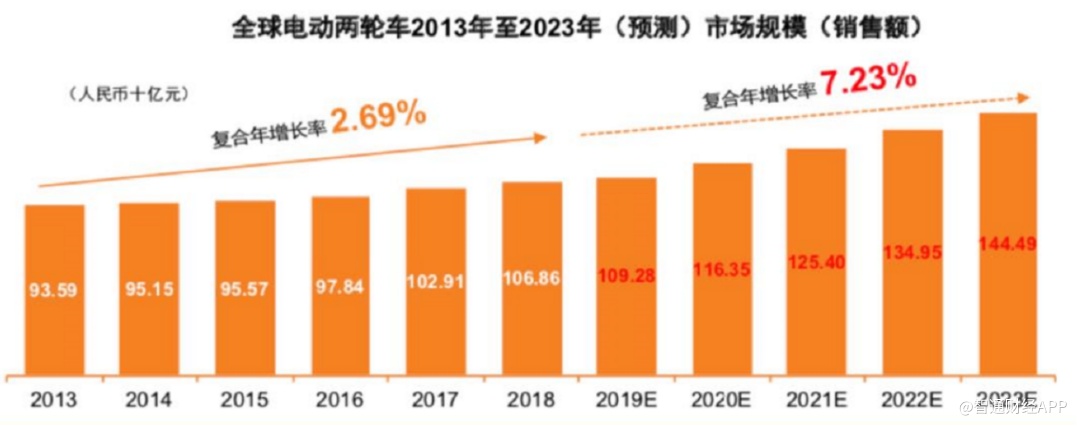 全球来看,弗若斯特沙利文预计两轮电动车市场将在2023年达到1444.9亿元,2019年至2023年的复合年增长率将提升至7.23%。