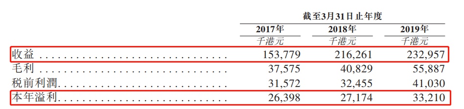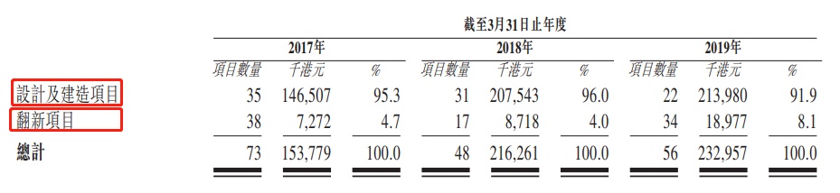 按照项目类型划分,华和控股的收益主要来自设计及建造项目、翻新项目,其中,前者占收入比例高达90%。截至2019年3月31日止三个年度,华和控股分别实现收益1.54亿港元、2.16亿港元、2.33亿港元;同期溢利分别为0.26亿港元、0.27亿港元、0.33亿港元;毛利率分别约为24.4%、18.9%及24.0%及净利率分别约为17.2%、12.6%及14.3%。