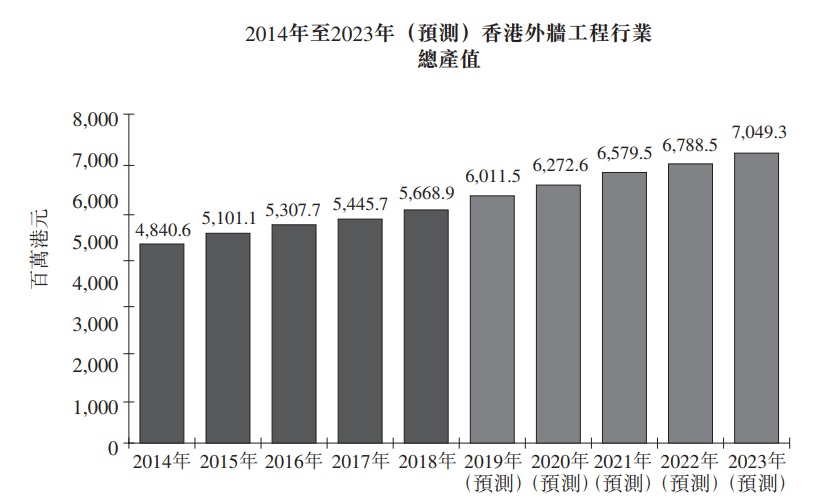 2018年,约30至40家大型公司进行外墙的工程,外墙工程行业被视为十分成熟及集中度较高。根据益普索报告显示,截至2019年3月31日止年度,华和控股的收益占2018年香港外墙工程行业市场份额的4.1%。