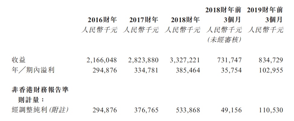 经调整纯利由2016财年的约人民币2.95亿元增至2018财年的约5.34亿元,复合年增长率为约34.6%;由2018财年前3个月约4916万元增加124.9%至2019财年前3个月约1.11亿元。