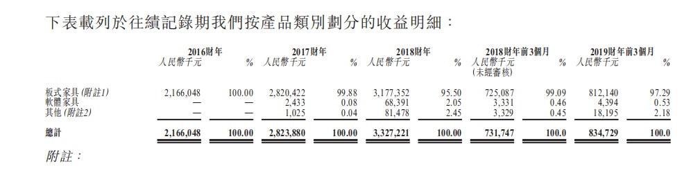 其中,板式家具为公司的主要收入来源。于往绩记录期,板式家具为公司主要产品,销量于2016财年、2017财年、2018财年及2019财年前3个月分别占收益的100.0%、约99.9%、95.5%及97.3%。