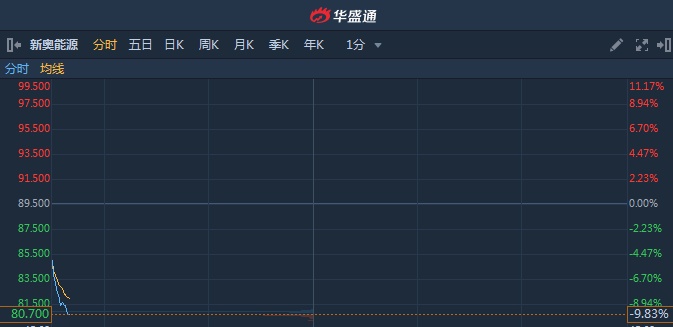 智通财经APP获悉,新奥能源(02688)拟获控股股东新奥国际转让32.83%股权予新奥生态控股,消息拖累股价早盘遭重挫,截至9时39分,跌9.83%,报价80.7港元,成交额1.64亿。