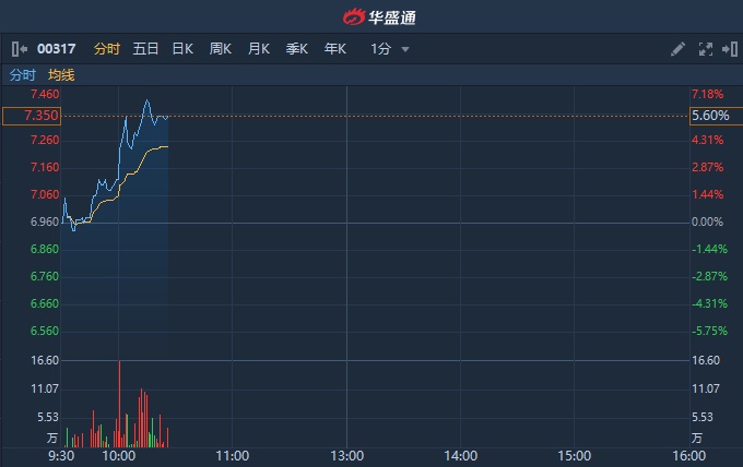 智通财经APP获悉,A股军工板块上演涨停潮。中船防务A股涨逾7%。截至发稿,中船防务(00317)涨5.6%,报7.35港元,成交额1196.07万港元。