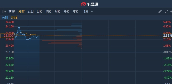 智通财经APP获悉,李宁(02331)早间公告称,李宁已获调任为公司联席行政总裁,早盘一度升逾4%,高见24.2港元,创历史新高。截至10时25分,涨2.81%,报价23.8港元,成交额5286万。