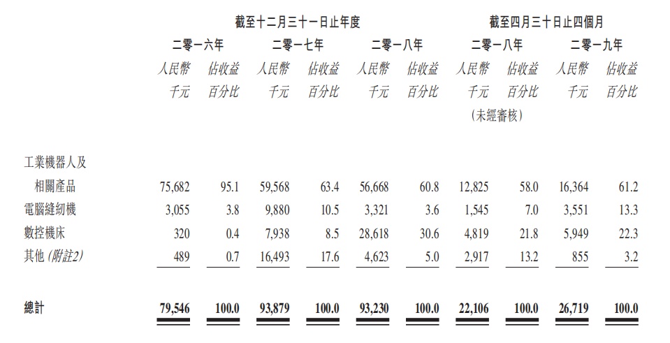 参照公司销售终端市场,公司将产品分为四组,即(i)工业机器人及相关产品;(ii)计算机缝纫机;(iii)数控机床;及(iv)其他工业自动化机械设备,包括电子、市政工程及建筑终端市场。