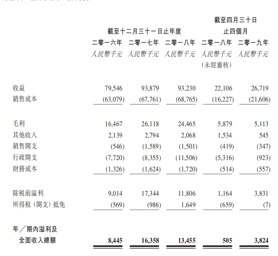 招股书显示,于往绩记录期间,公司收入来自于销售工业自动化机械设备铸件。2016-2018年及2019年前四个月,公司收入分别约为7955万元(人民币,下同)、9388万元、9323万元及2672万元;年/期内溢利及全面收入总额分别约为845万元、1636万元,1346万元及382万元。于往绩记录期间,公司收入均源自于中国进行的业务。